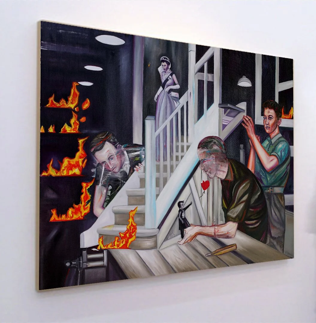 Bode's image shows a sinister backdrop or stage in which several people are trying to drape miniature figures. The miniatures appear to be the Queen and Banksy's famous balloon girl. The miniatures seem more lifelike than the injured builders and main actors.